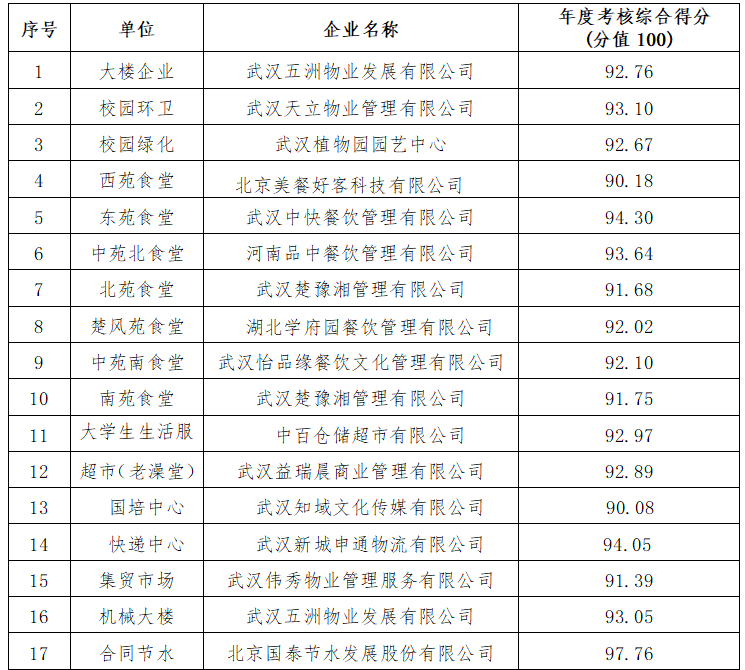 公示时间3天,公示期间各企业及广大师生员工若有异议,请电话联系后勤管理处目标管理办公室,联系电话:027-59750328。