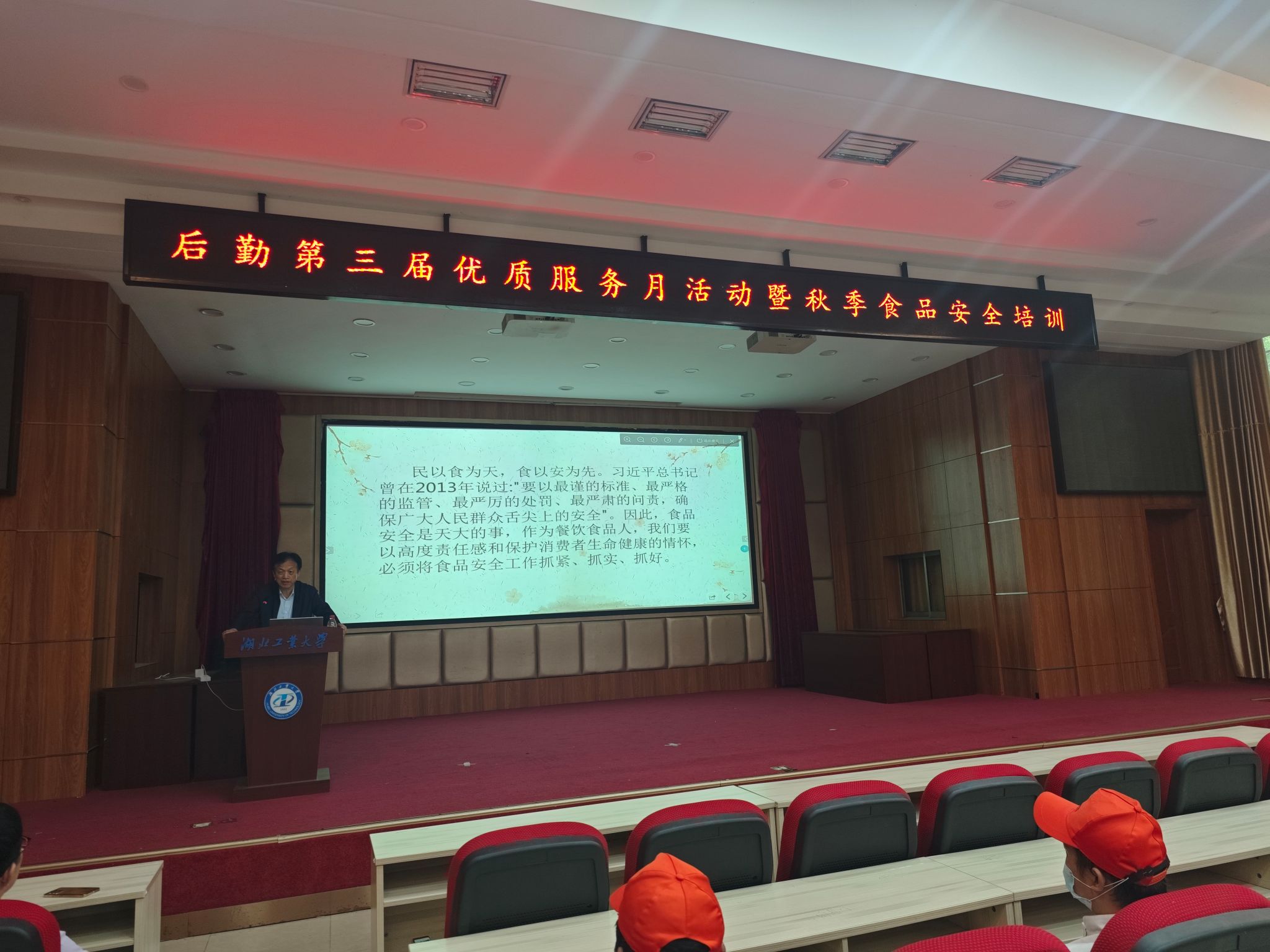 为加强学校食堂安全管理水平,保障广大师生饮食安全,在第三届“后勤优质服务月”活动期间,饮食管理与服务中心主动对接洪山区市场监督管理局,邀请“湖北省有突出贡献中青年专家”王盛桥研究员于11月13日下午进校作高校食堂食品安全专题培训。后勤管理处饮食管理与服务中心全体人员及各餐饮服务企业现场管理人员、从业人员近300人参加了此次培训。