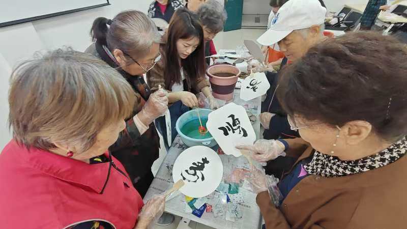 活动伊始,社工通过“小蜜蜂嗡嗡嗡”小游戏迅速点燃了现场氛围,老年居民们在欢声笑语中锻炼了反应能力,同时也拉近了邻里之间的距离。随后,湖工书法社的志愿者们挥毫泼墨,在空白团扇上为老人们送上美好的寄语,一笔一划间传递着温暖与祝福。