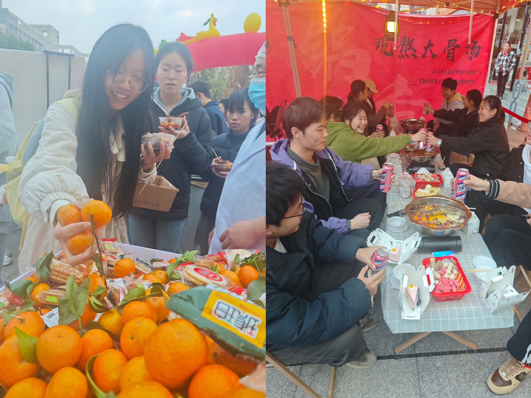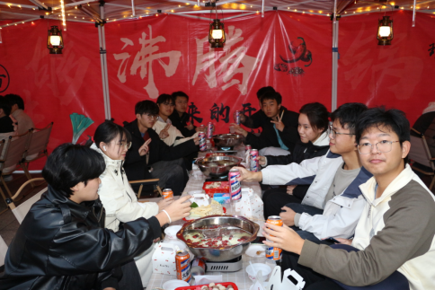 本次活动,武汉星星餐饮有限公司还为当天过生日的同学准备了一场特别的生日宴,60 名 12 月5日生日的幸运学生齐聚一堂,围坐在独具特色的“地摊火锅”旁,共同庆祝生日。现场水果零食堆积如山,为这场盛宴更添几分甜蜜。东苑食堂餐饮员工倾心服务,“食客”欢声笑语,其乐融融。期末备考的学子在热辣美食中汲取了温暖与力量,舒缓了学习的压力;现场所有人都沉浸于美味之中,尽情感受校园生活的缤纷多彩。
