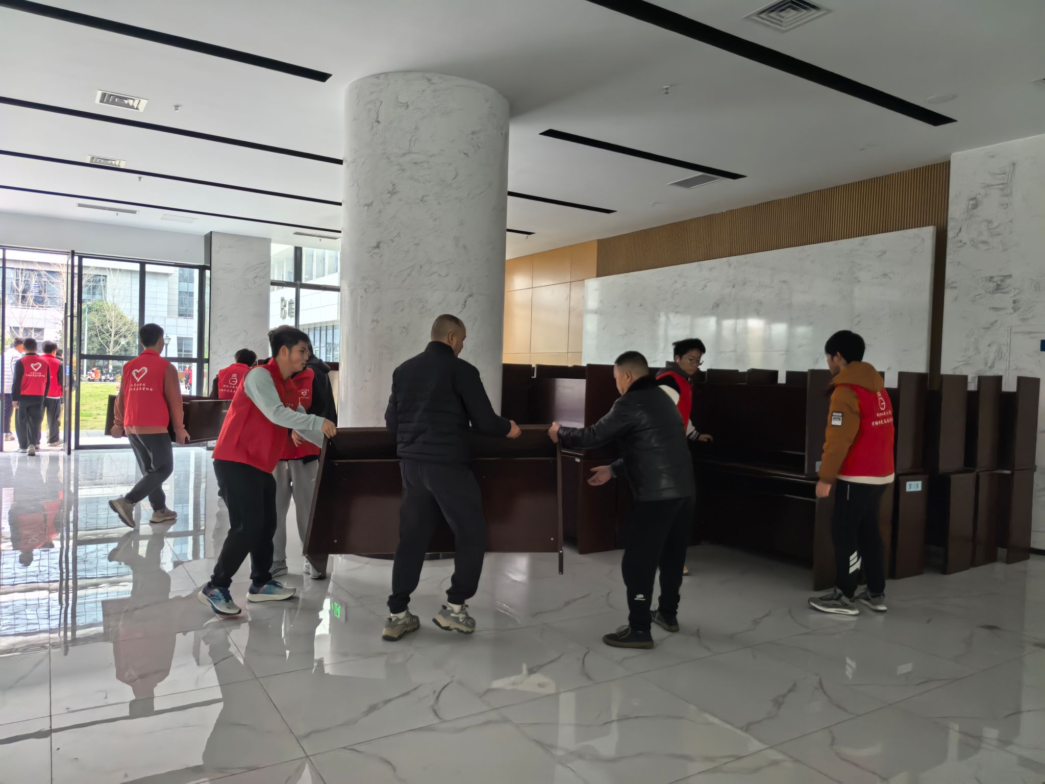 活动中,同学们热情高涨,男同学抬桌子,女同学搬椅子,分工协作、密切配合,现场气氛热烈而有序。后勤工作人员与老师全程参与劳动并指导,同时还为同学们准备了姜糖水。