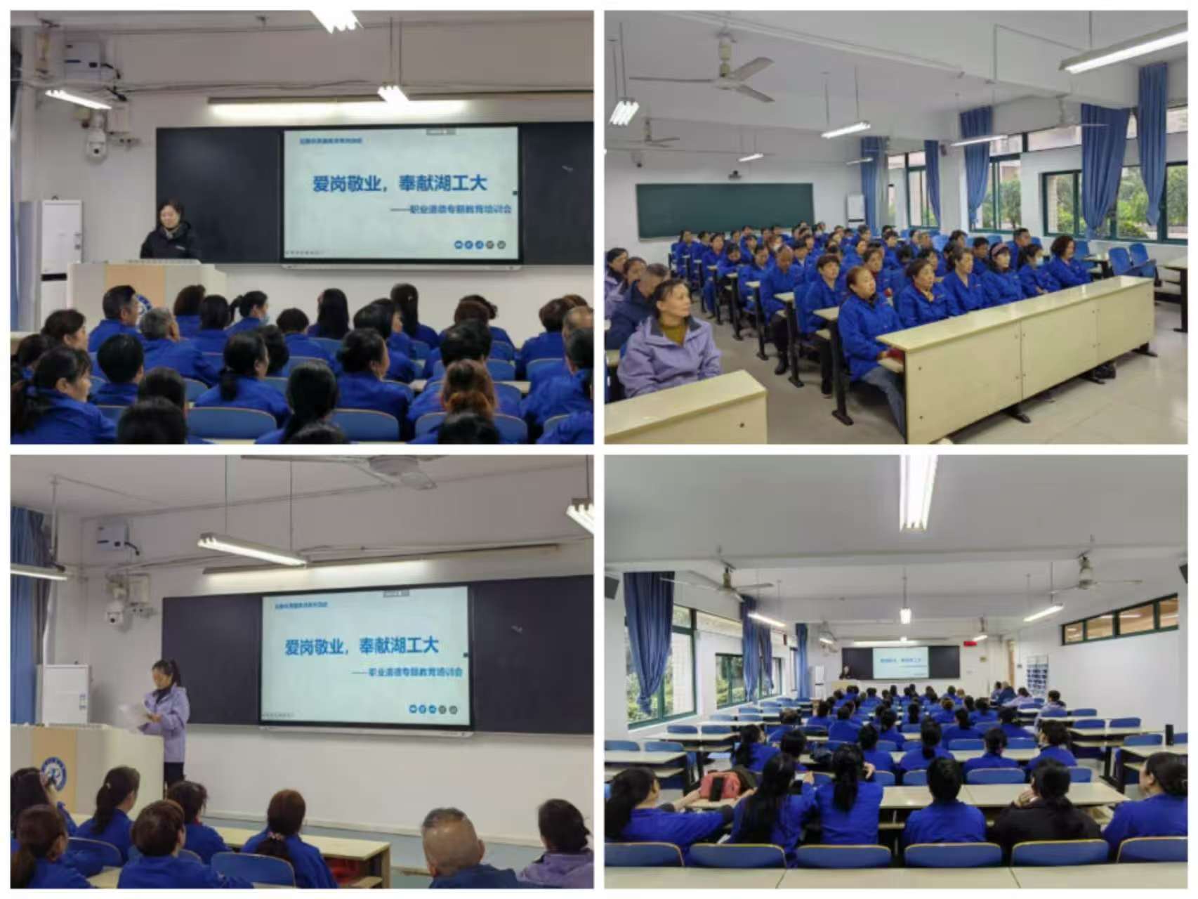 11月6日,物业管理与服务中心组织各物业服务企业员工在2号教学楼举办了“爱岗敬业,奉献湖工大”为主题的职业道德专题教育培训会,进一步强化员工职业素养和服务意识,号召全体物业员工将职业道德规范内化于心、外化于行,用实际行动为师生提供“优质、高效、贴心”的物业服务。